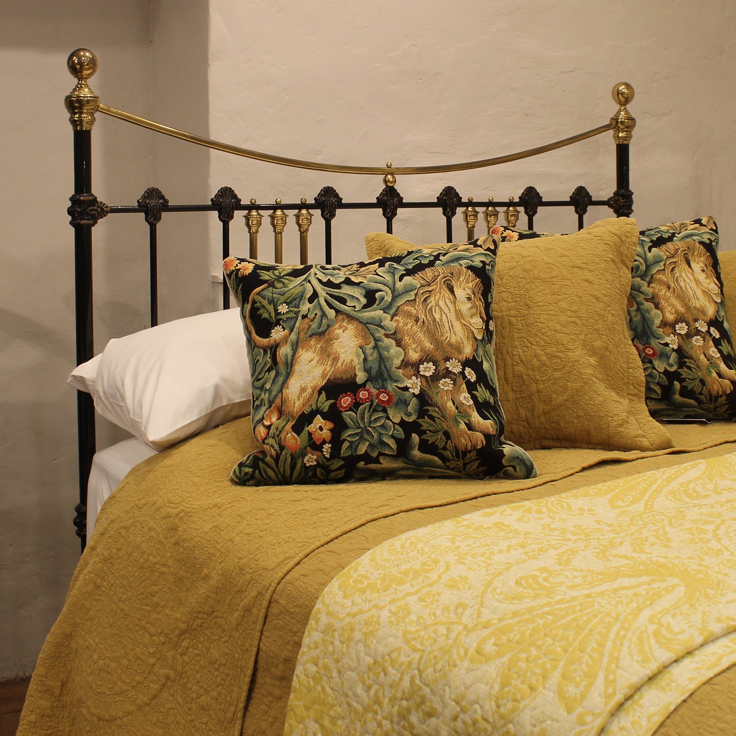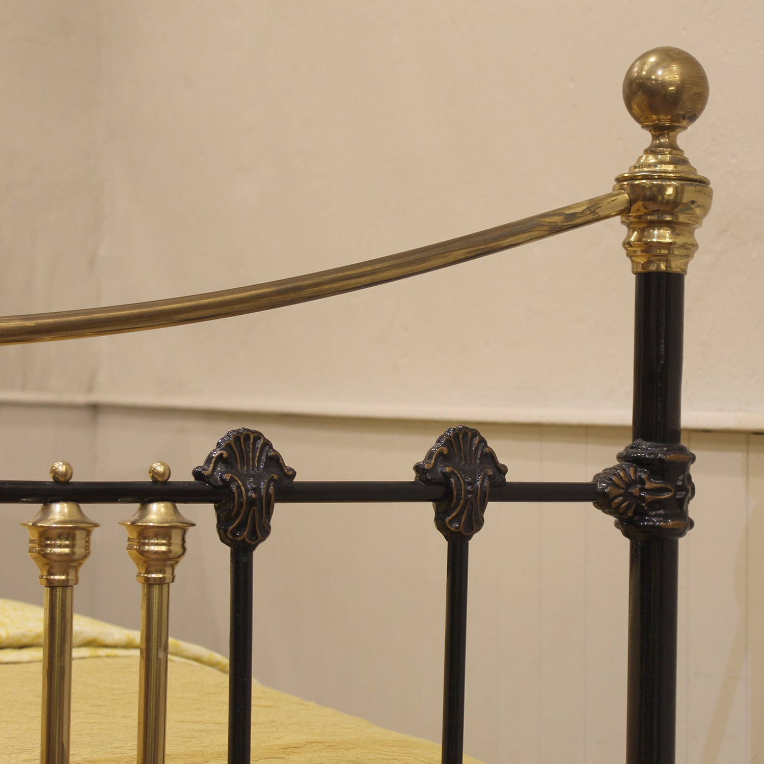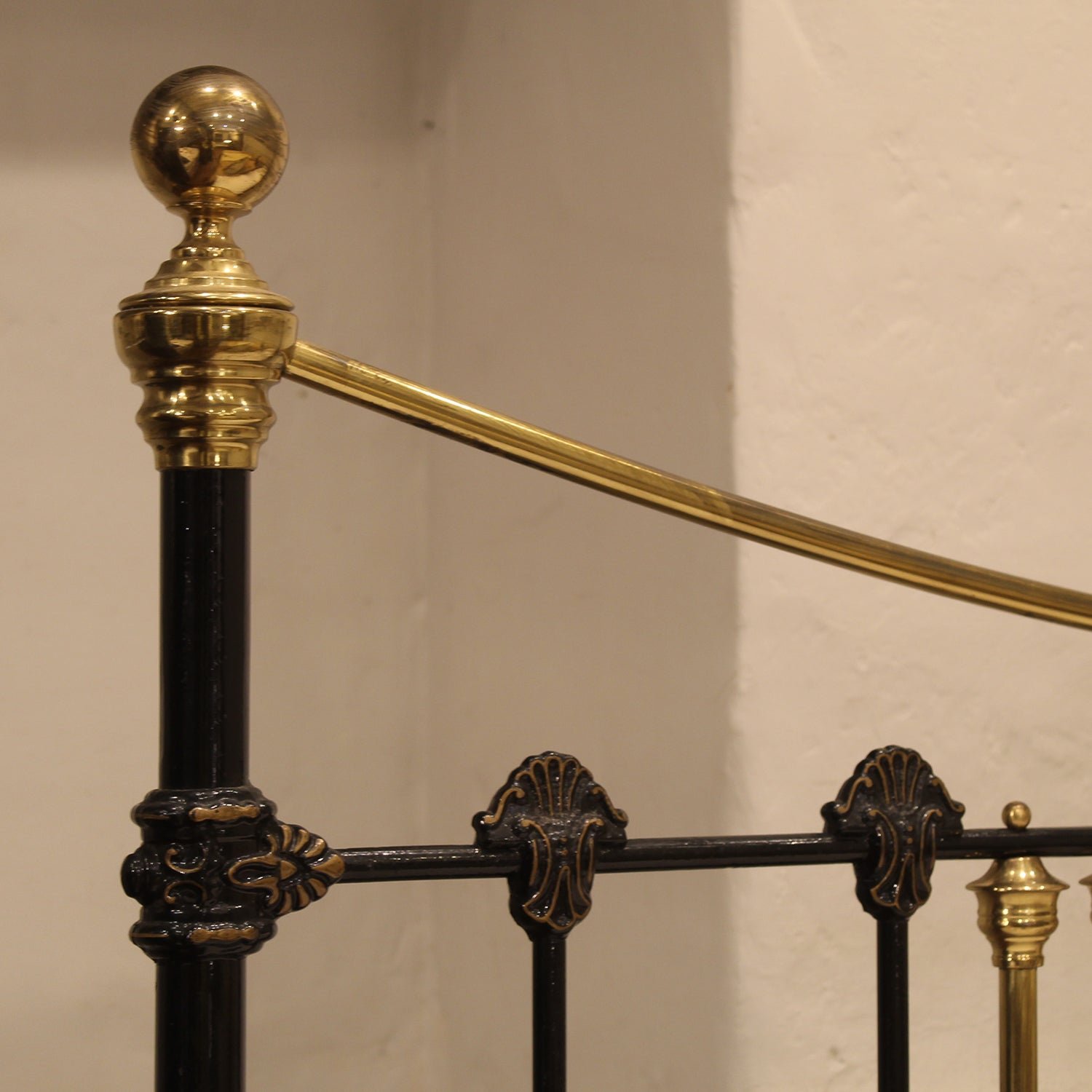 A late Victorian brass and iron double antique bed with curved brass top rails, spherical brass knobs, and brass decoration in head and foot boards finished in traditional black. The decorative castings have highlights of faded gold lining, whereas the brass has a golden patina and is still coated with lacquer, protecting from further aging. The bed retains its original castors, but these can be removed if preferred.