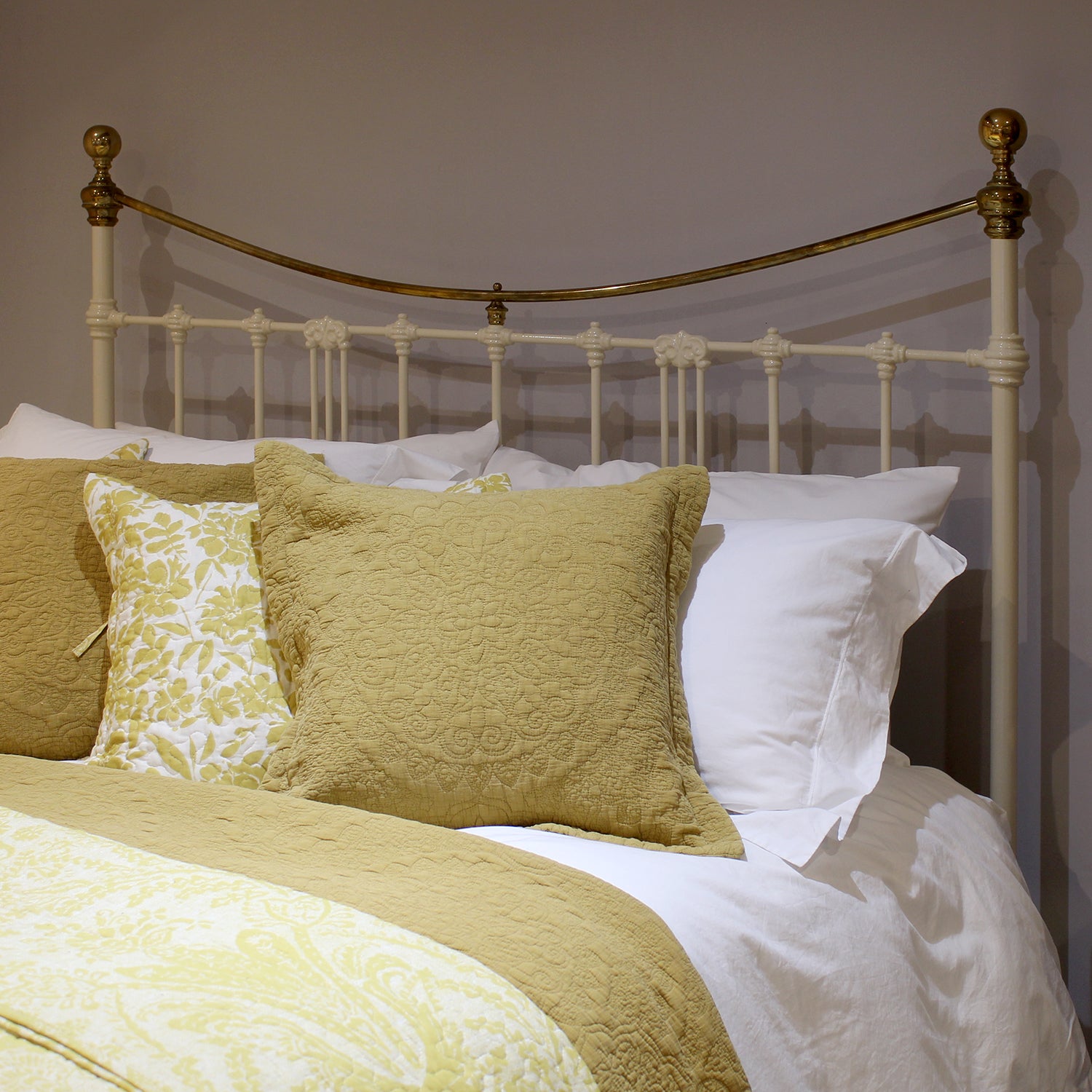 A late Victorian brass and iron antique bed, circa 1890 finished in a soft cream with ornate Art Nouveau inspired castings.