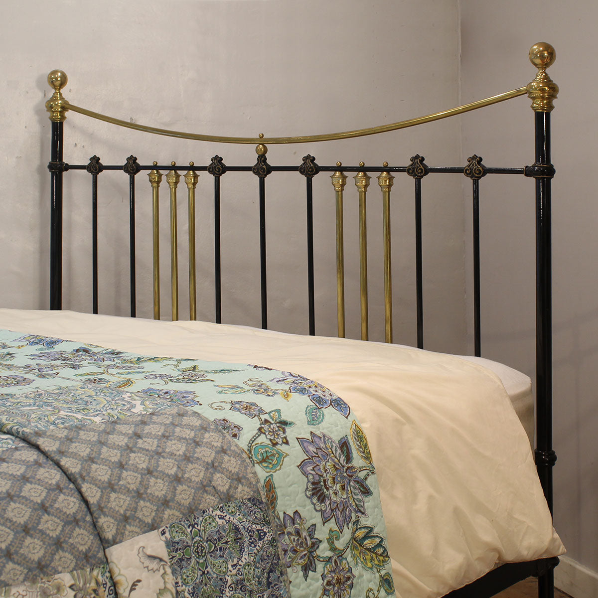 A late Victorian brass and iron antique bed, circa 1890 finished in a black with faded gold-lining on the castings, curved brass top rails and round knobs.