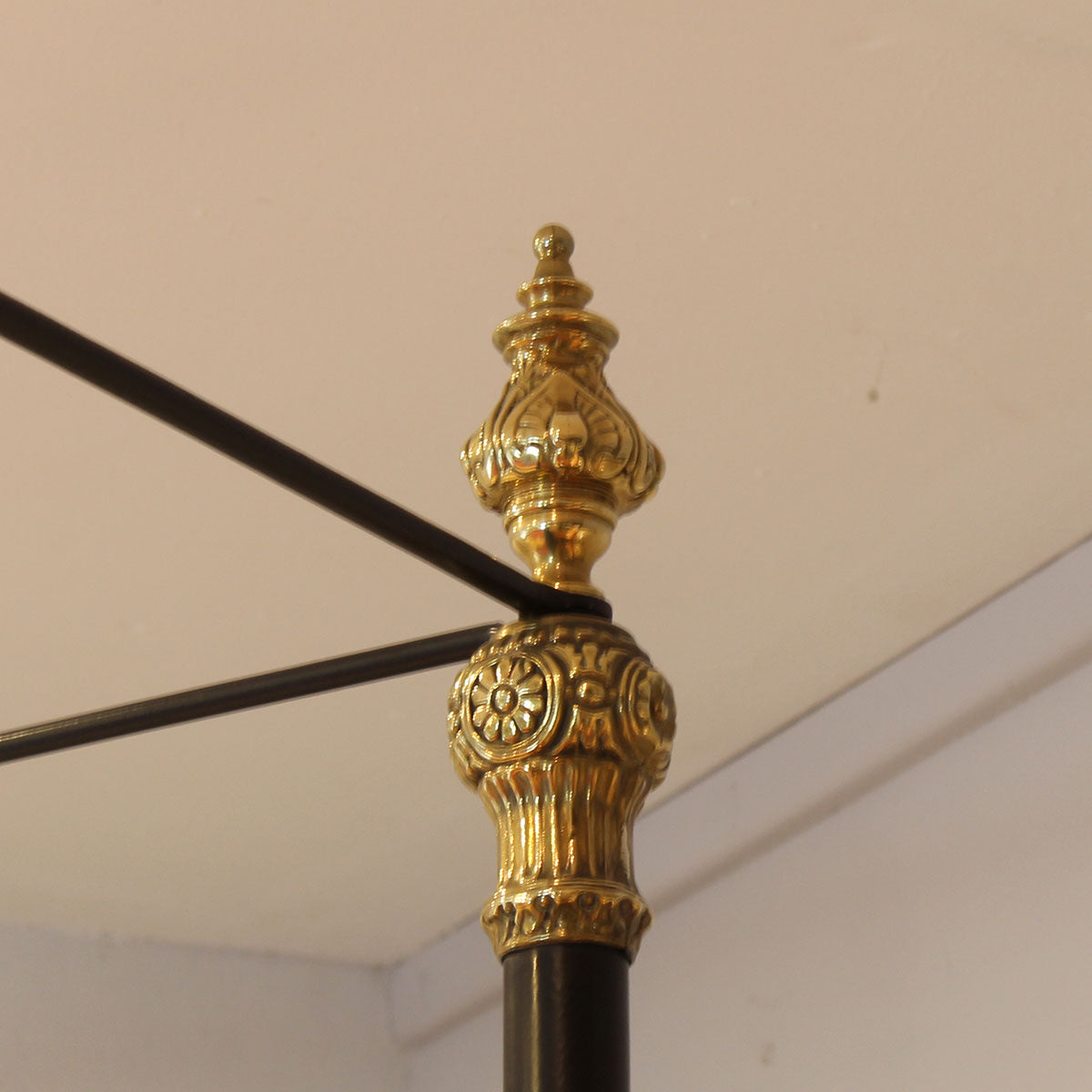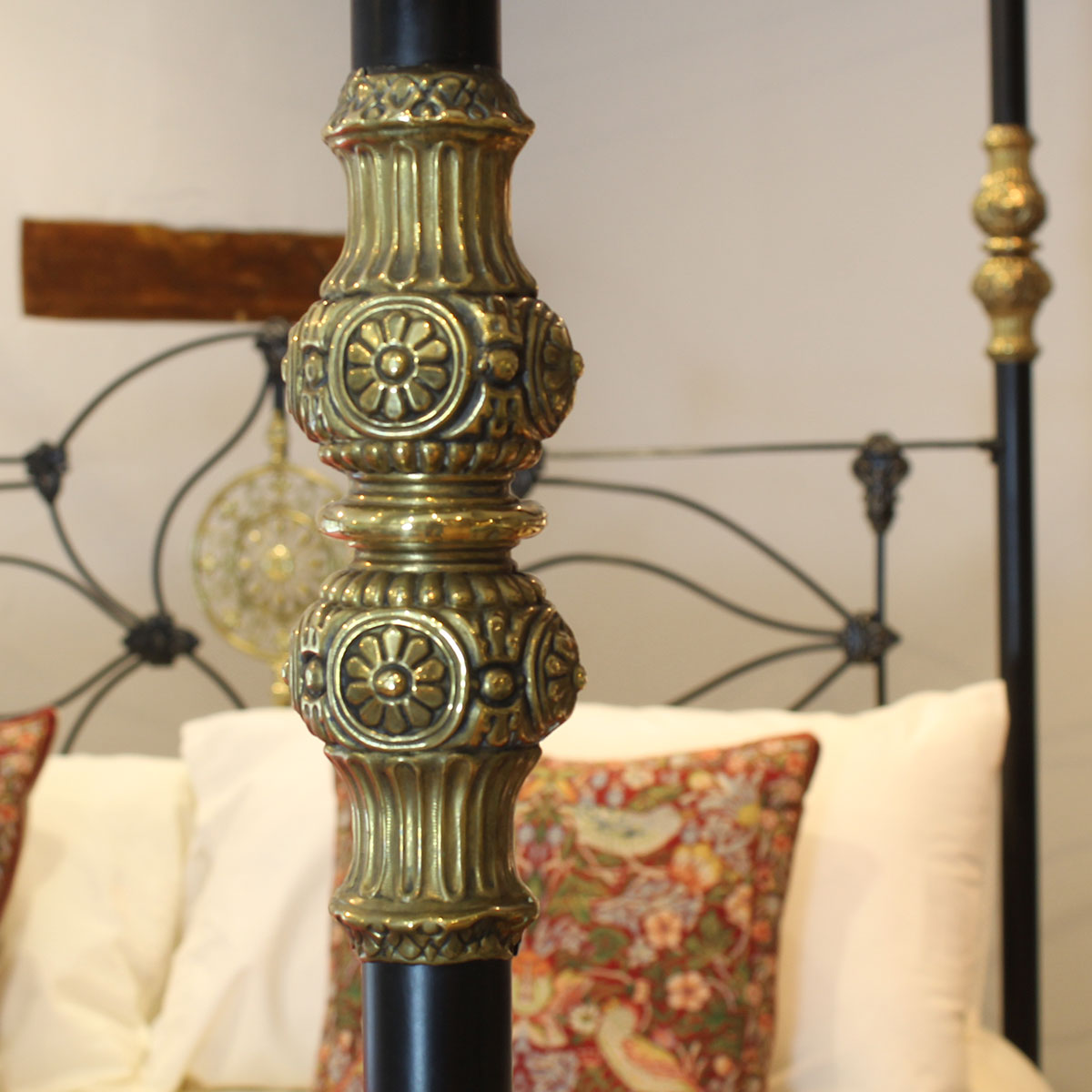 The ornate panels at the head and foot of the bed have ornate castings, and central feature of a brass plaque. The four posts are mounted by ornate cast knobs and support a canopy.