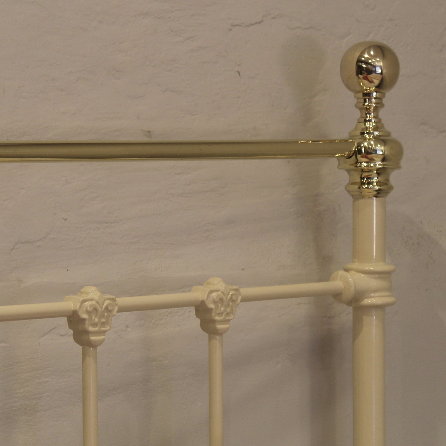 A Victorian brass and cast iron platform bedstead finished in cream with straight brass top rail. Circa 1890.