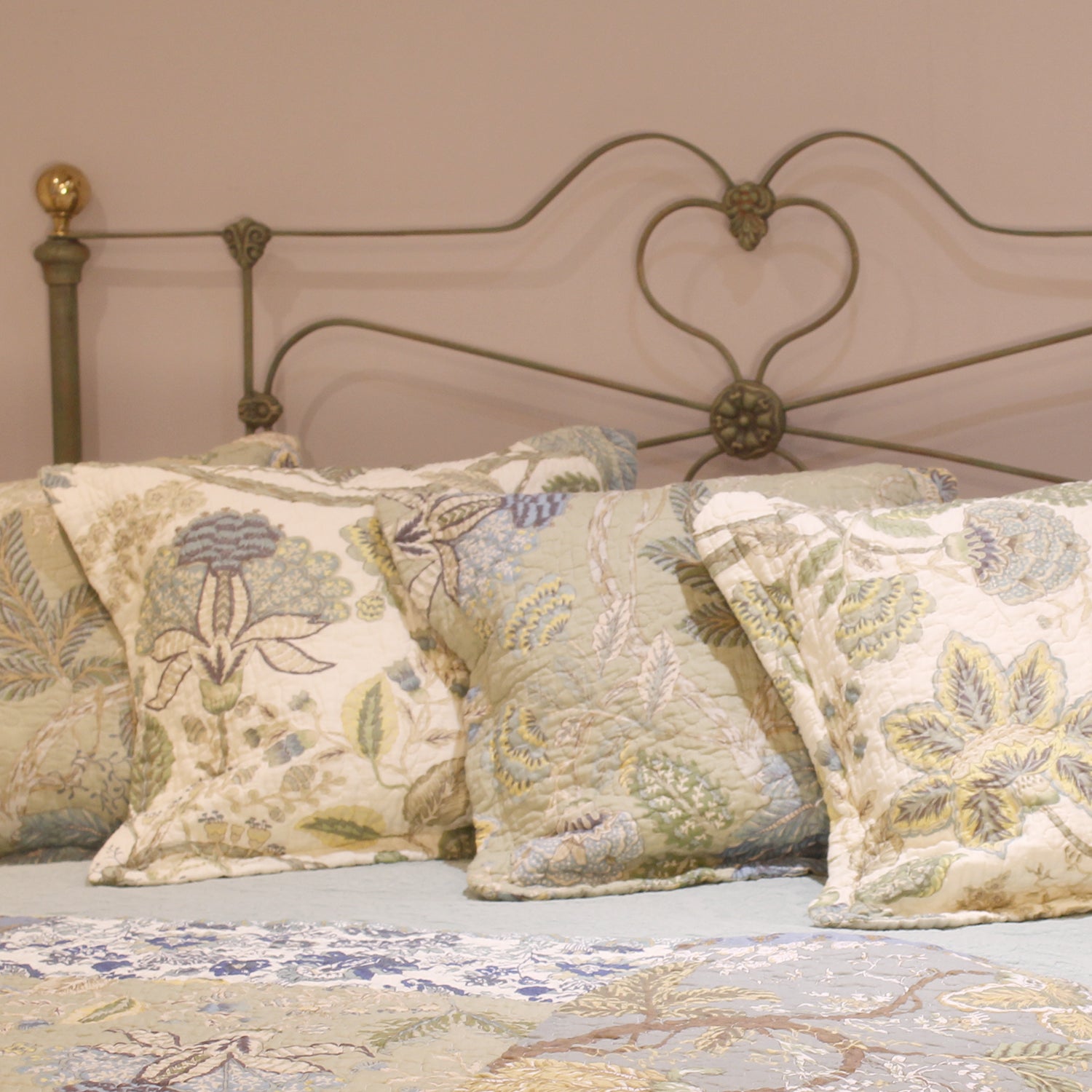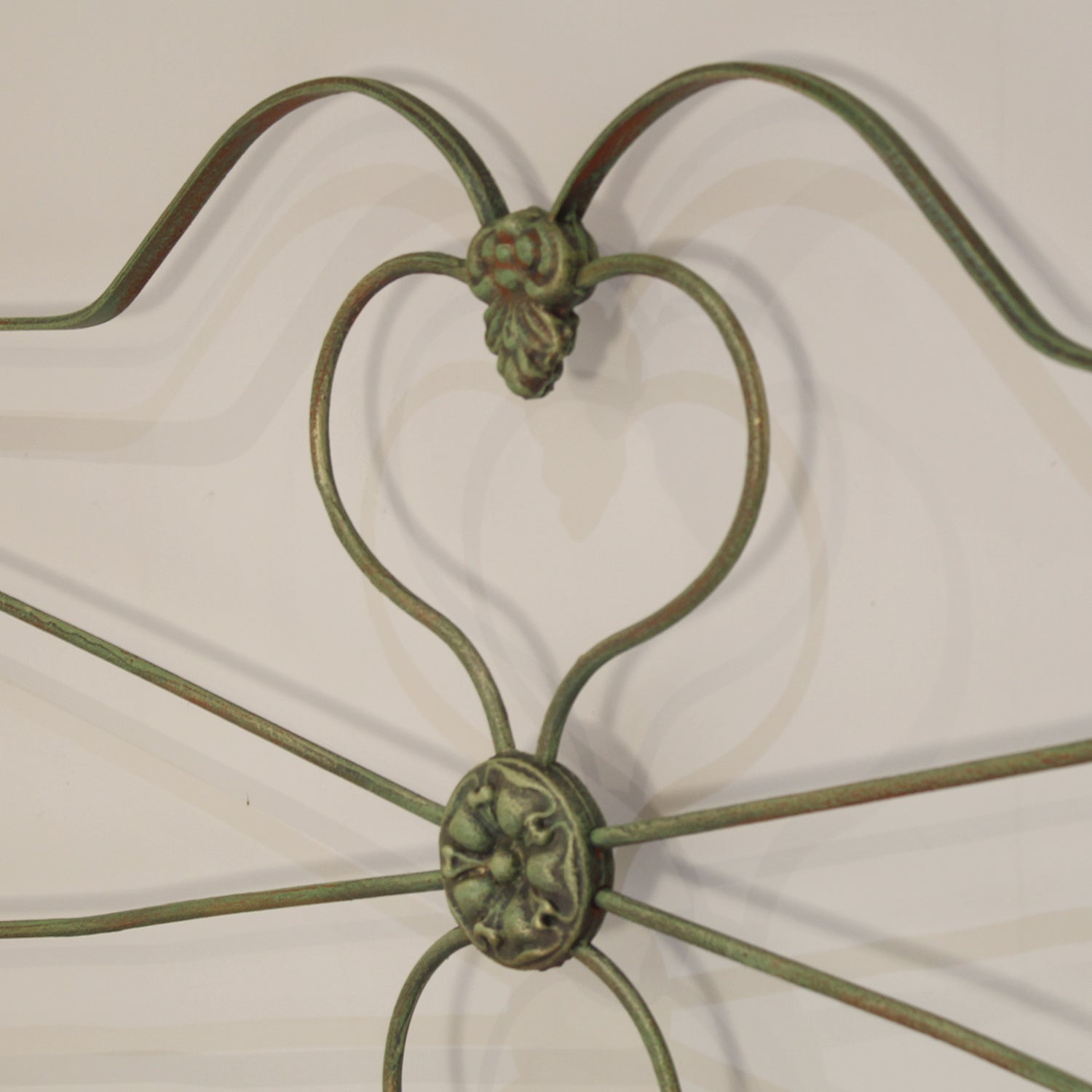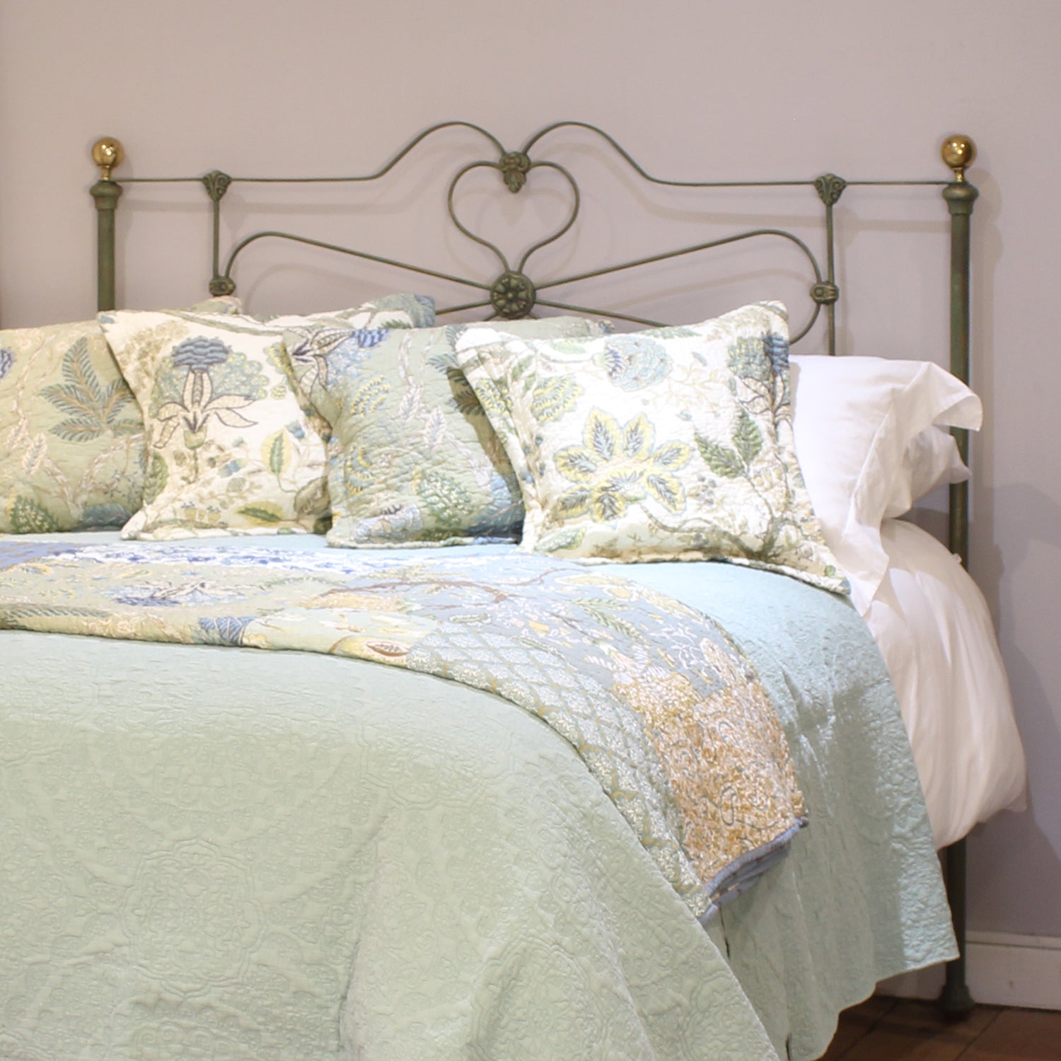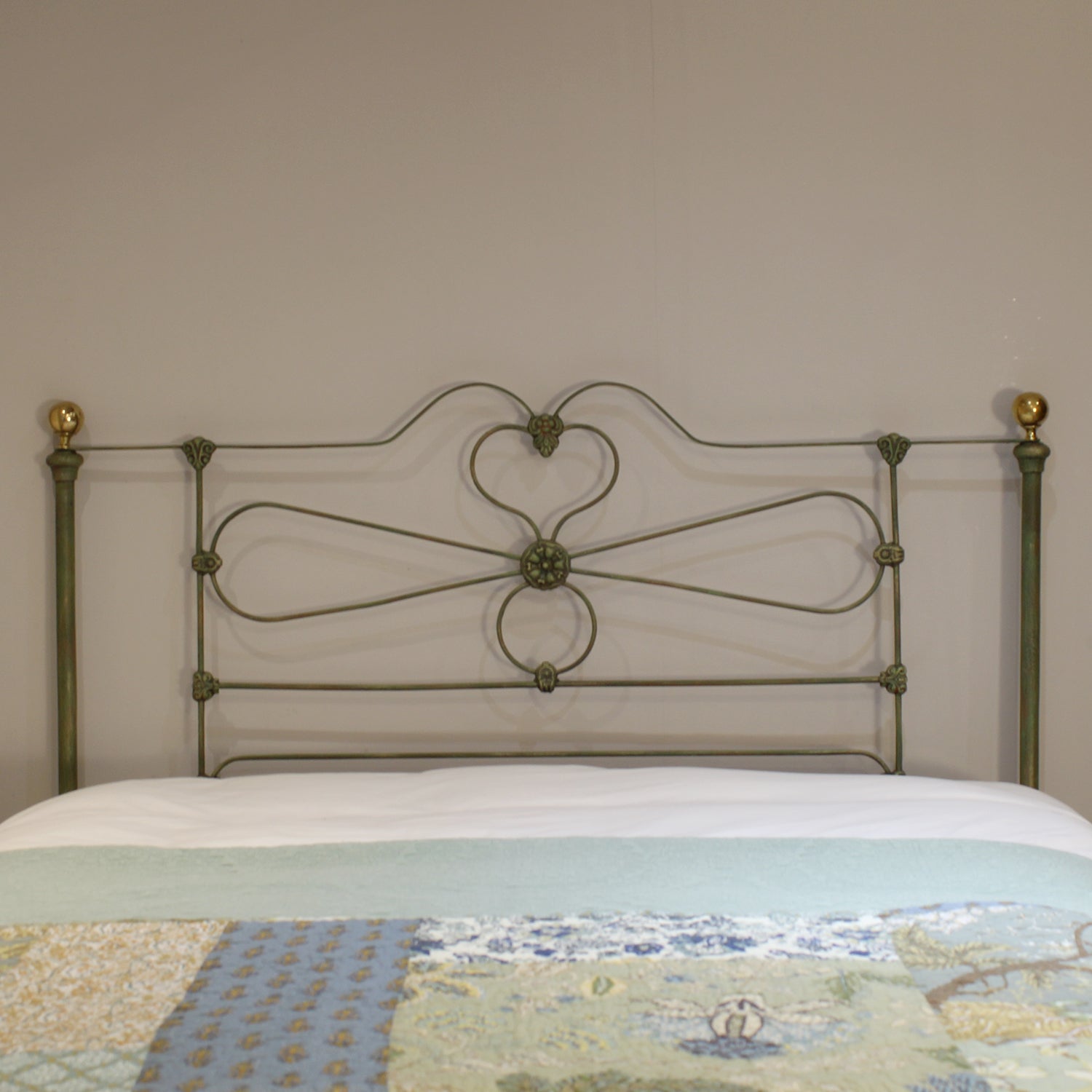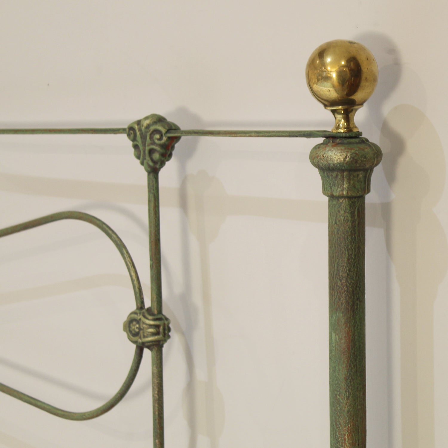 A fine example of an antique cast iron and brass bed finished in Green Verdigris with curved cast iron head panel and low foot board, adapted from an original bed circa 1880.