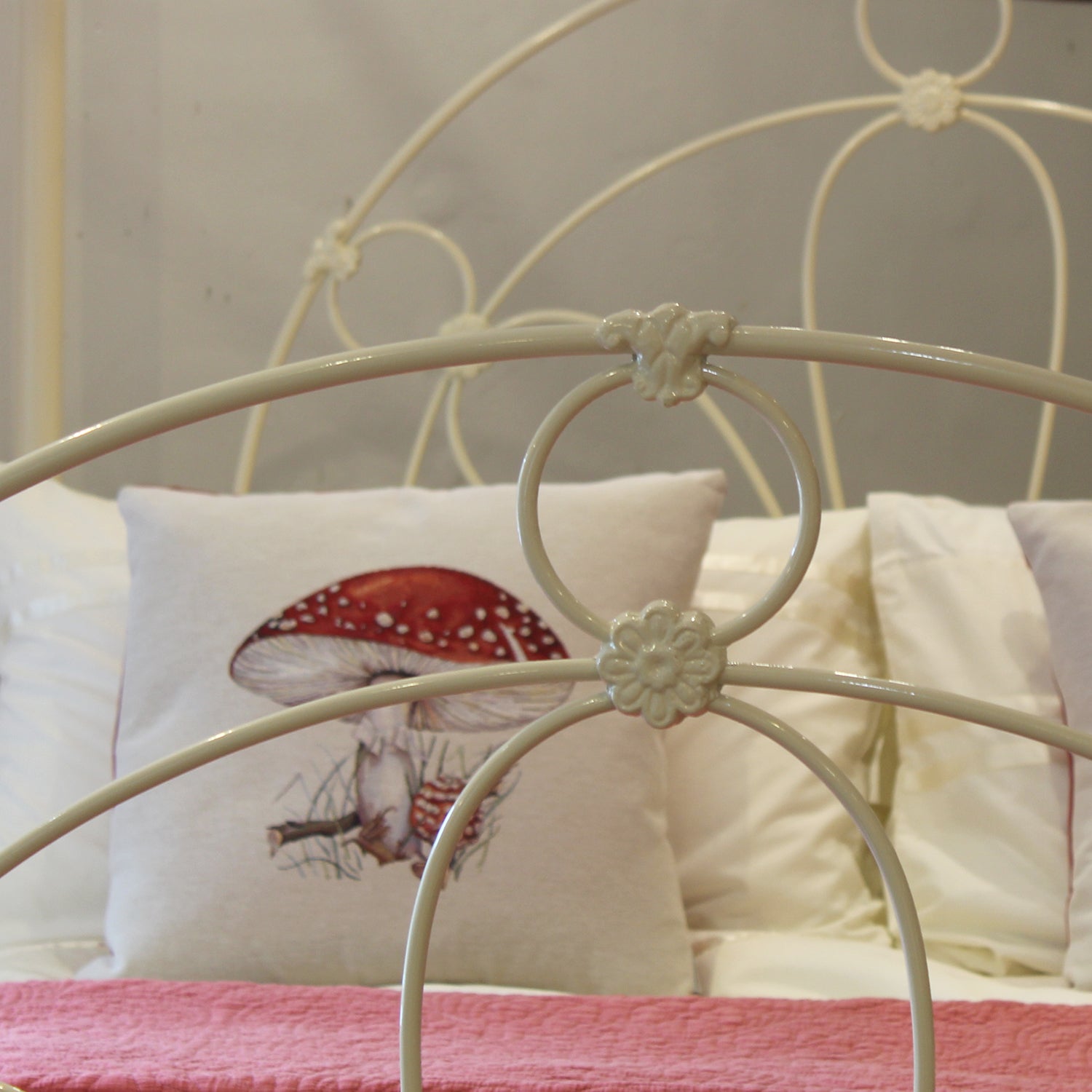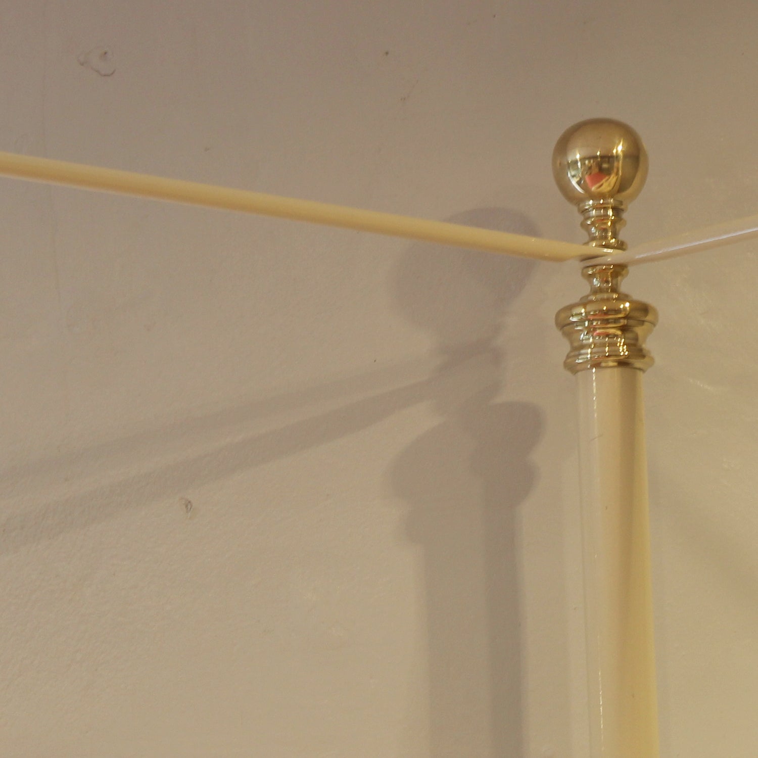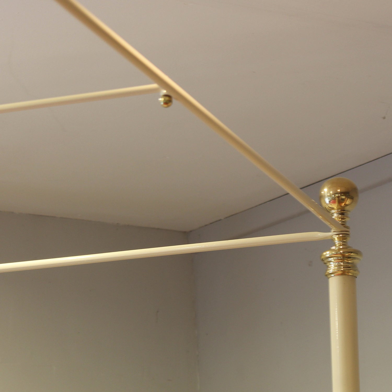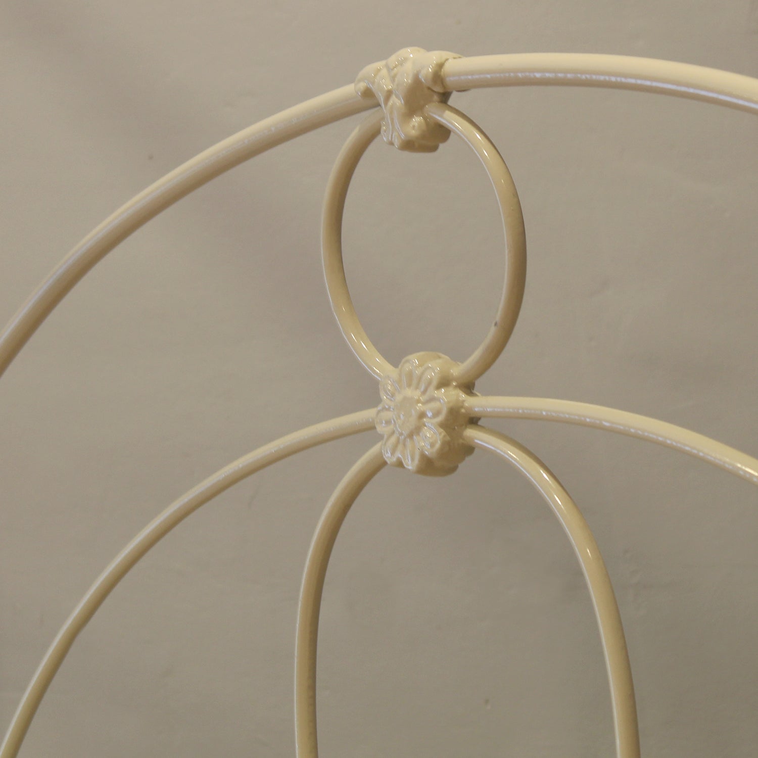 A superb iron four poster bed with sunburst design head and foot panels finished in soft cream.