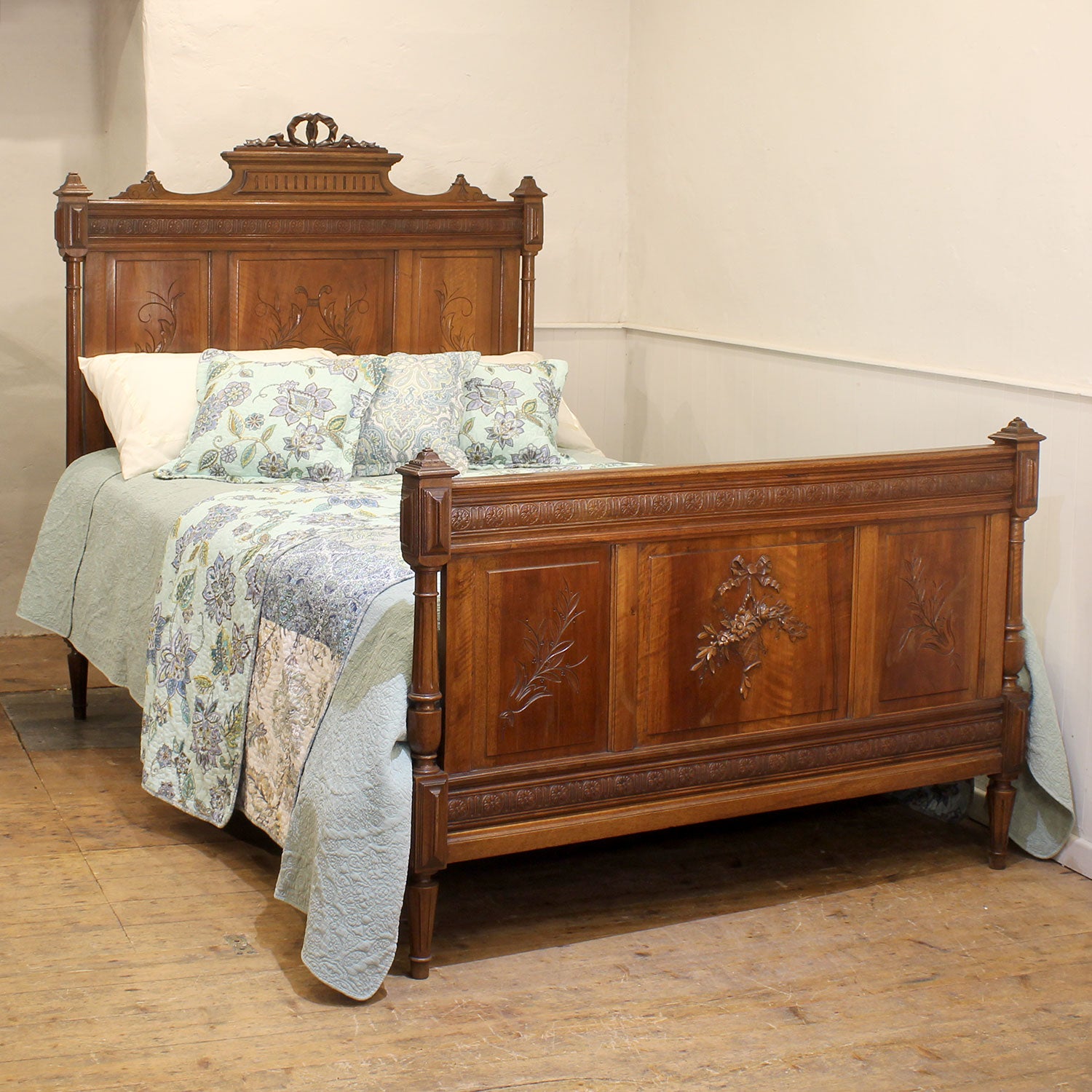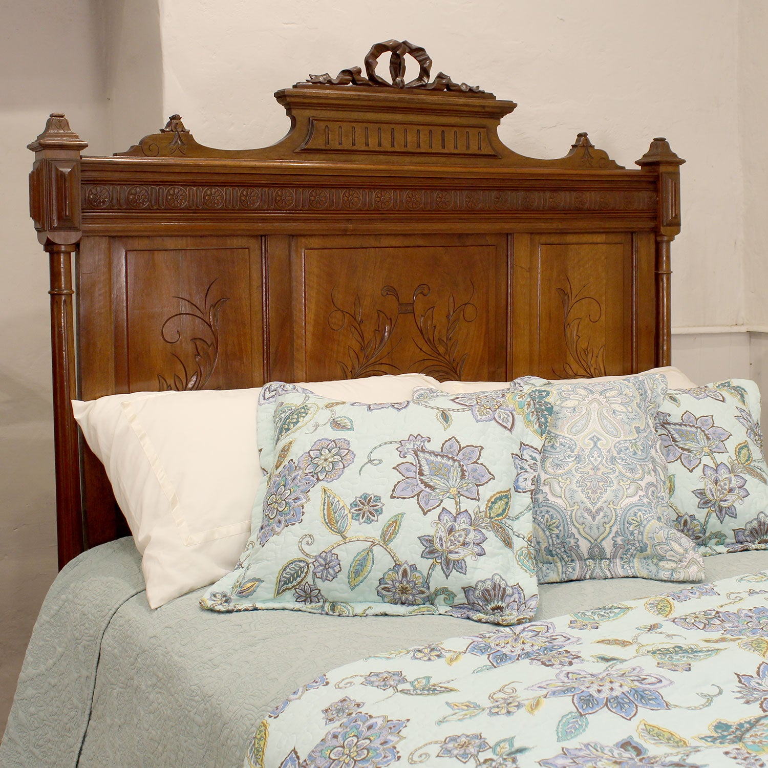 A finely carved French walnut antique bed with carved panels, fluted posts and garland pediment. Circa 1900.